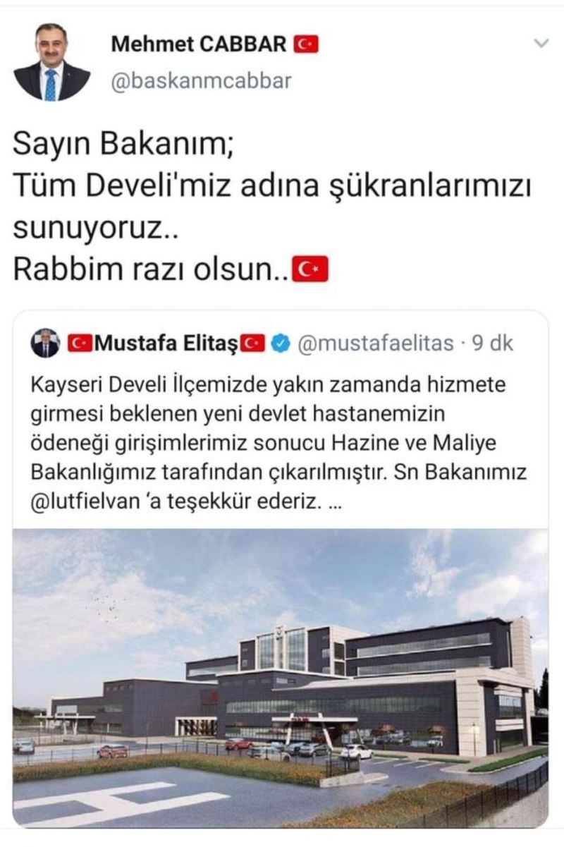 AK Parti Develi İlçe Başkanı Osman Turan ise, paylaşımında, ödeneklerin çıkmaması nedeniyle uzayan Develi Devlet hastanesinin ödemesini Maliye Bakanlığının yaptığını belirtti. Turan, "Develi’miz de yakın zamanda hizmete girmesi beklenen ve ödeneklerinin çıkmaması sebebiyle hizmete girmesi uzayan yeni devlet hastanemizin ödemesi Maliye Bakanlığımız tarafından gerçekleşmiştir. Ödeneğin çıkması için çok çaba sarf eden bakanımız Mustafa Elitaş’a ilçem adına teşekkür ediyorum" diye konuştu.