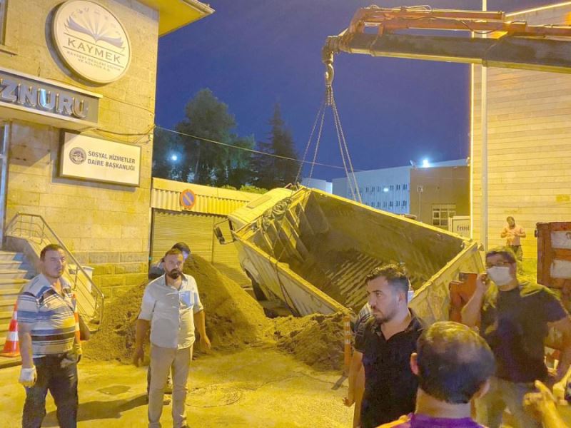 Kayseri'nin Kocasinan ilçesinde kum yüklü kamyonun ağırlığına dayanamayan yol çökünce kamyonet adeta şaha kalktı.