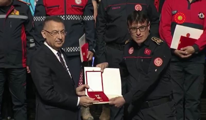 Cumhurbaşkanı Recep Tayyip Erdoğan tarafından tevcih edilen madalyayı Cumhurbaşkanı Yardımcısı Fuat Oktay, Kayseri Büyükşehir Belediyesi İtfaiye Daire Başkanlığı Müdahale ve Arama Kurtarma Şube Müdürü Muhammet Zeynuddin Bağdat’a takdim etti.