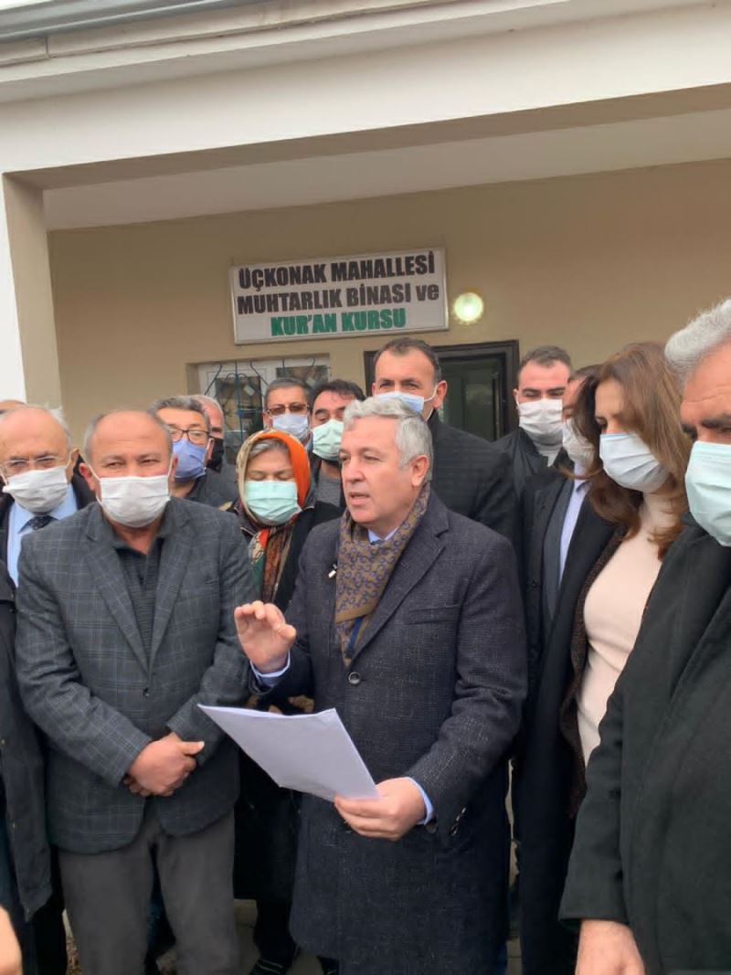 CHP’liler Pusatlı’nın ardından köy konağının çatısının tadilat edildiği belirtilen Üçkonak Mahallesi’ni ziyaret ederek, Üçkonak Muhtarı Duran Kaya’dan bilgi aldılar. CHP Milletvekili Arık, “Sayın Muhtarım burada 350 metrekare mantolama, 100 metrekare fayans, bir adet kalorifer, 15 Adet petek, 1 adet kalorifer tesisatı kullandıkları gibi iç cephe boyası kullanılmış. Doğru mu?” diye sordu. Muhtar Kaya, “Burada bir metrekare mantolama yok. Kalorifer de yok. Soba yakıyoruz” diye yanıt verdi.