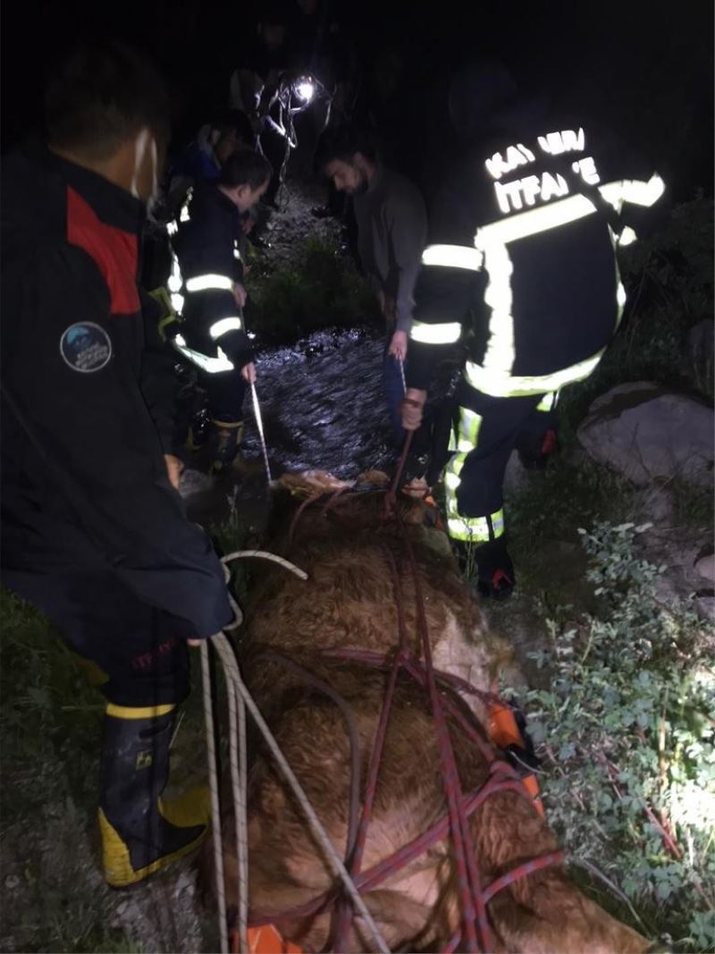 Öte yandan, itfaiye ekiplerinin derenin şiddetli akıntısı ve zorlu şartlar altında büyükbaş hayvanı kurtarmak için canla, başla mücadelesi amatör kameralara da yansıdı.