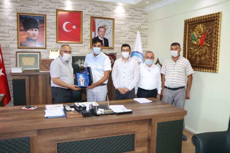 Şube Başkanı Çelik Belediye Başkanı Aksoy’a günün anısına plaket hediye etti.(İHA) -