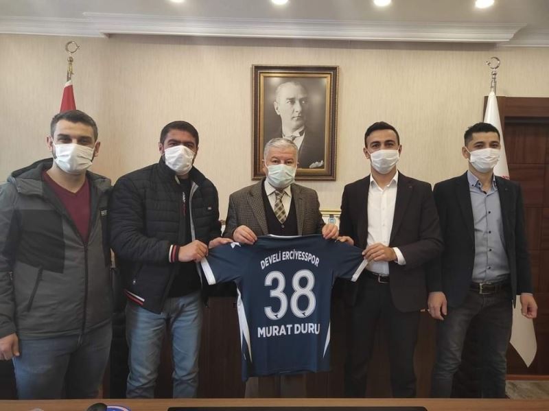 Develi’de uzun yıllar futbol oynayan isimlerin bir araya gelerek kurdukları Develi Erciyesspor Develi Kaymakamı Murat Duru’yu ziyaret ederek 38 numaralı Develi Erciyesspor forması hediye etti.