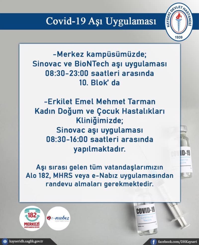 Kayseri Devlet Hastanesi’nden yapılan duyuruda, "Merkez kampüsümüzde Sinovac ve BiaNTech aşı uygulaması 08:30-23:00 saatleri arasında 10. Blok’ta Erkilet Emel Tarman Kadın Doğum ve Çocuk Hastalıkları Kliniğimizde Sinovac aşı uygulaması 08:30-16:00 saatleri arasında yapılmaktadır.