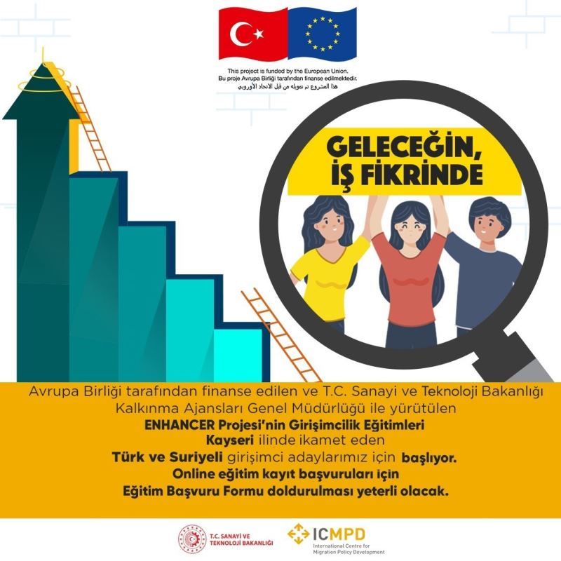 Avrupa Birliği tarafından finanse edilen ve T.C. Sanayi ve Teknoloji Bakanlığı Kalkınma Ajansları Genel Müdürlüğü işbirliği ile ICMPD (Uluslararası Göç Politikaları Geliştirme Merkezi) tarafından yürütülen “Sürdürülebilir Sosyoekonomik Entegrasyon İçin Girişimcilik Kapasitelerinin İyileştirilmesi Projesi” (ENHANCER), kapsamındaki girişimcilik eğitimi Kayseri’de yaşayan Türk ve geçici koruma sağlanan Suriyeli girişimci adaylarına yönelik olarak başlıyor. Projeye ilişkin detaylı bilgiye https://enhancerproject.com/ adresinden ulaşılabilecek ve eğitimler Mayıs-Haziran-Temmuz aylarında devam edecek.