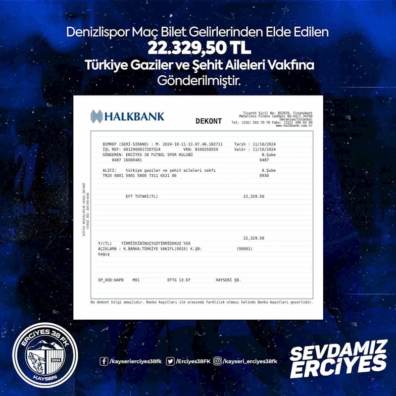 Türkiye 3. Lig 4. Grupta bulunan Erciyes 38 Futbol Kulübü, iki hafta önce sahasında oynadığı Denizlispor maçının gelirini Şehit Aileleri Derneği’ne bağışladı. Kulüp sosyal medya hesaplarından yapılan açıklamada; Erciyes 38 Futbol Kulübü’nden Türkiye Gaziler ve Şehit Aileleri Vakfı hesabına 29 bin 329 Türk Lirası 50 kuruş gönderildiği bildirildi.