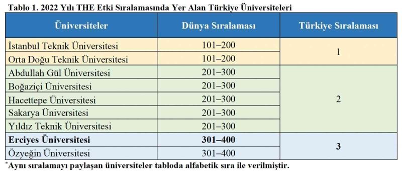 Birleşmiş Milletlerin (BM) Sürdürülebilir Kalkınma Hedefleri göz önüne alınarak yapılan ve kurumsal veriler dikkate alınarak gerçekleştirilen THE 2022 Yılı Etki Sıralamasında Erciyes Üniversitesi önemli bir başarı gösterdi. Dünyada 110 ülkeden 1524 üniversitenin katıldığı bu uluslararası sıralamada Erciyes Üniversitesi 301-400 bandında yer alırken, ulusal sıralamada ise Özyeğin Üniversitesi ile birlikte 3. sırada yer aldı.