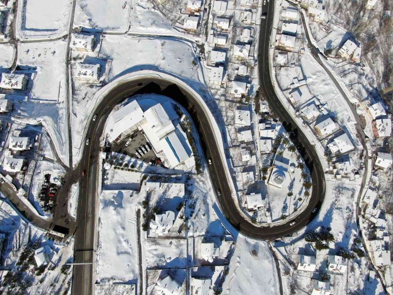 Beyaza bürünen Erciyes’te havadan çekilen görüntüler kartpostallık görüntüler ortaya çıkarırken, Erciyes’e giden kıvrım kıvrım yolları da adeta yılanı andırdı.