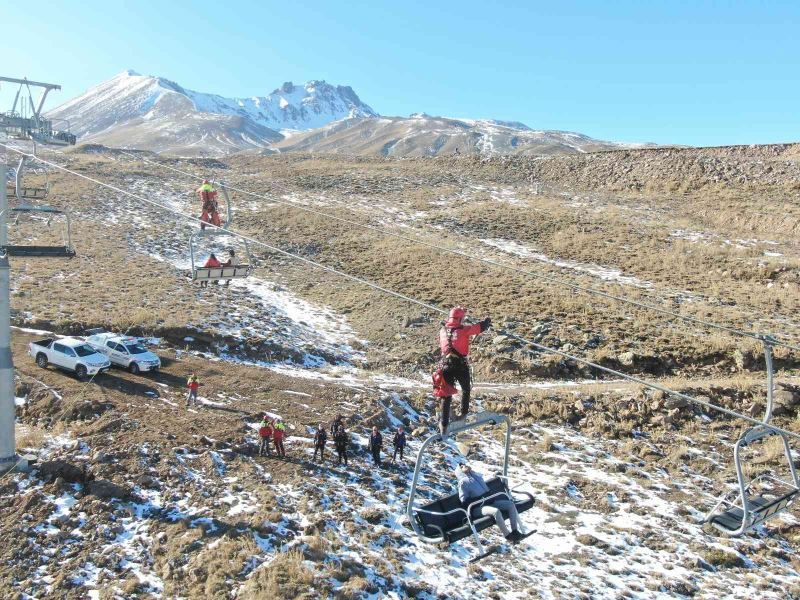 Türkiye’nin önemli kayak merkezlerinden biri olan Erciyes Dağı’nda, sezon öncesinde gerçekleştirilen tatbikat gerçeğini aratmadı. Senaryo gereği teleferikte mahsur kalan vatandaşlar, ekipler tarafından kısa sürede kurtarıldı.