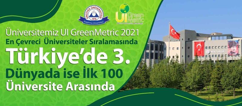 Dünya üniversitelerini çevreye duyarlılık, enerji, atık, ulaşım yönetimi ve sürdürülebilirlik alanlarında değerlendiren UI GreenMetric Dünya Üniversiteleri Sıralama Sistemi 2021 yılı sonuçları açıklandı. Erciyes Üniversitesi (ERÜ) 956 üniversitenin sıralandığı değerlendirmede dünya üniversiteleri arasında 99. sırada, Türkiye Üniversiteleri arasında sıralamaya giren 71 üniversite içerisinde 3. sırada, devlet üniversiteleri arasında ise 2. sırada yer aldı.