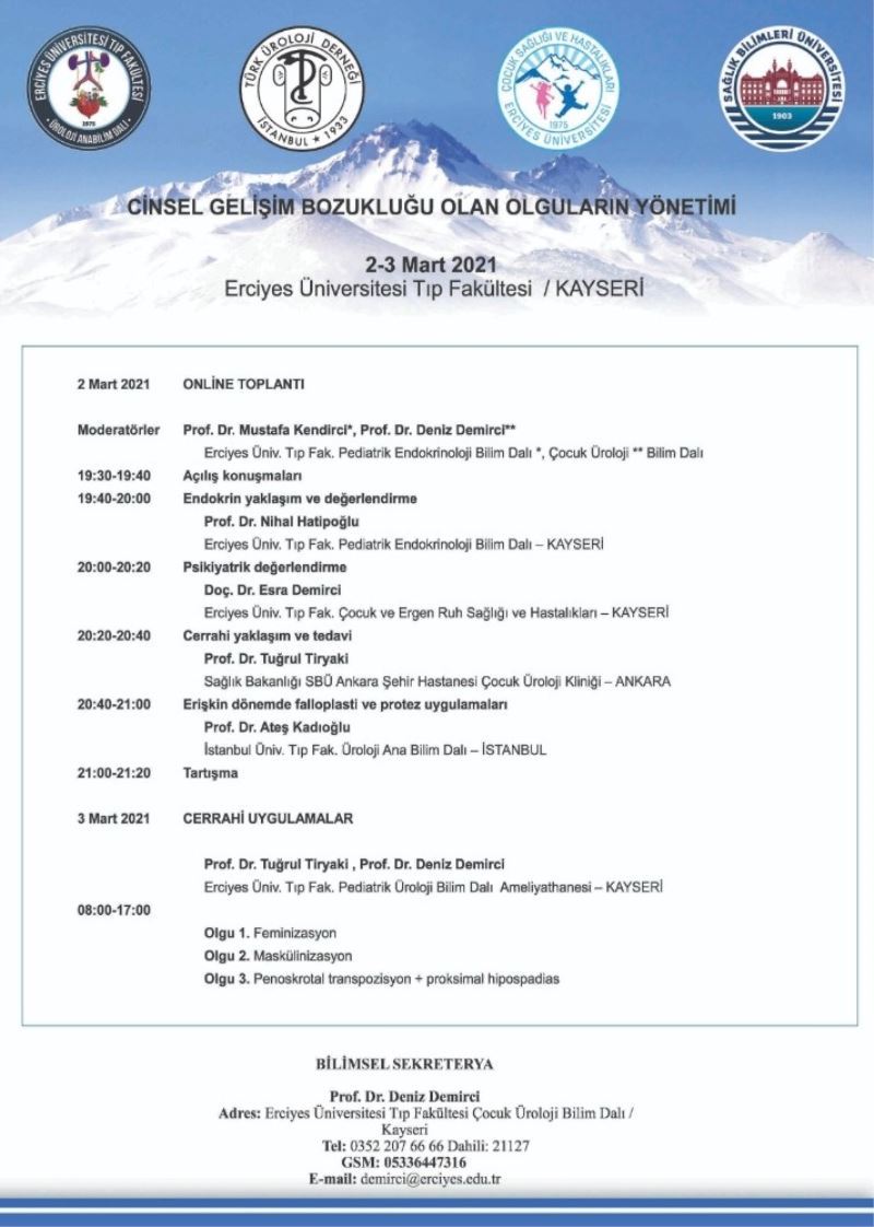 Türk Üroloji Derneği’nin katkılarıyla Erciyes Üniversitesi Tıp Fakültesi’nin ev sahipliğinde düzenlenecek olan ’Cinsel Gelişim Bozukluğu Olan Olguların Yönetimi’ Toplantısı 2-3 Mart tarihlerinde online olarak yapılacak. 2 Mart’ta ’endokrin yaklaşım ve değerlendirme’, ’cerrahi uygulamalar’ olarak iki oturumda yapılacak olan toplantının moderatörlüğünü ise Prof. Dr. Mustafa Kendirci ve Prof. Dr. Deniz Demirci yapacak.