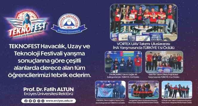 Elde edilen derecelere göre; Uluslararası İHA yarışlarında ERÜ Vortex Uav Takımı Öğrencileri uluslararası İHA yarışmasında Türkiye birincisi, EnvironPro takımı, Üniversite Öğrencileri Araştırma Proje Yarışmaları ana kategorisinde “Sağlık” alt kategorisinde Türkiye ikincisi, VNEURAL takımı öğrencileri Sağlıkta Yapay Zeka ana kategorisinde “Bilgisayarlı Görüyle Tarama Mamografilerinde BI-RADS Kategorisi ve Meme Kompozisyonu Tahmini Yarışma Kategorisi” alt kategorisinde Üniversite klasmanında yarışmaya katılan 363 takım arasından Türkiye beşincisi, Havacılık Teknolojileri Takımı, Dikey İnişli Roket Yarışmasında Türkiye üçüncüsü, Mühendisler Birliği Kulübü’nün proje takımı olan Sangal İHA Takımı ve GÖKAY UAV takımı ise Uluslararası İnsansız Hava Aracı Yarışması performans ödülü almaya hak kazandı.
