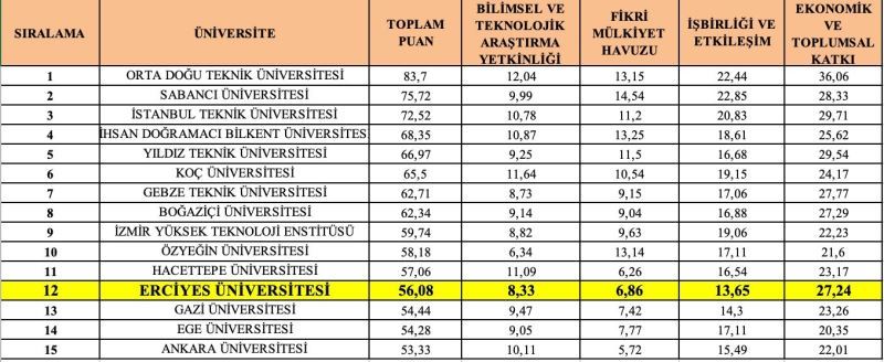 TÜBİTAK tarafından 2021 yılı “Girişimci ve Yenilikçi Üniversite Endeksi” açıklandı. Öğretim üyesi sayısı 50’nin üzerinde olan 191 üniversitenin dikkate alındığı sıralamada üniversiteler, Bilimsel ve Teknolojik Araştırma Yetkinliği, Fikri Mülkiyet Havuzu, İşbirliği ve Etkileşim ve Ekonomik Katkı ve Ticarileşme olmak üzere dört kategoride ve 23 göstergeye göre değerlendirilerek toplam puana göre sıralandı.