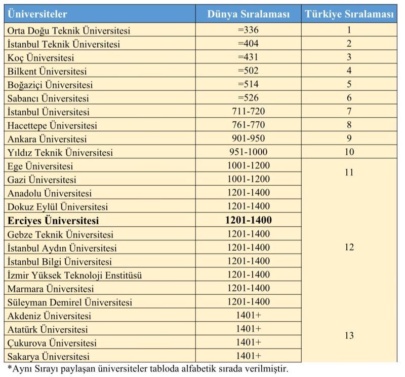Türkiye’den 20’si devlet, 5’i vakıf olmak üzere toplam 25 üniversitenin yer aldığı sıralamada, ERÜ Dünyada 1201-1400 aralığında yer alırken, ülkemizde ise 8 üniversite ile birlikte 12. sırada, devlet üniversiteleri arasında ise 6 üniversite ile birlikte 9. sırada yer alarak önemli bir başarı elde etti.