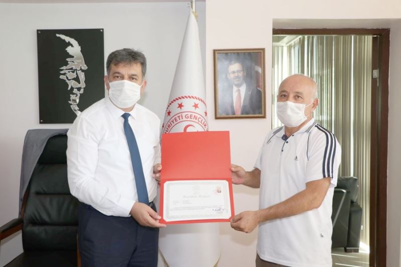 Kayseri Gençlik ve Spor İl Müdürü Murat Eskici, Güreş İl Temsilciliği görevini yürüten Naci Doğan’a Antalya’ya tayin olması sebebiyle teşekkür belgesi takdim etti.