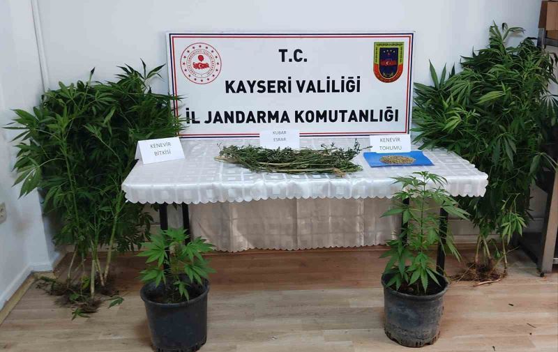 Kayseri İl Jandarma Komutanlığı ekiplerince yapılan çalışmalarda evinde kenevir bitkisi yetiştiren şahıs gözaltına alınırken çeşitli miktarlarda uyuşturucu madde ele geçirildi.