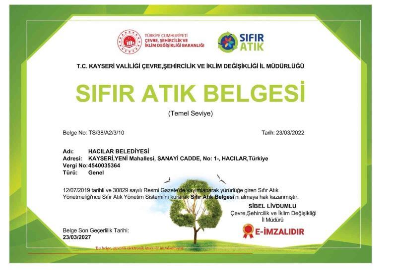 Cumhurbaşkanı Recep Tayyip Erdoğan’ın eşi Emine Erdoğan’ın himayesinde Çevre ve Şehircilik Bakanlığı’nca başlatılan Sıfır Atık Projesi çerçevesinde örnek belediyecilik sergileyen Hacılar Belediyesi sıfır atık belgesi aldı.