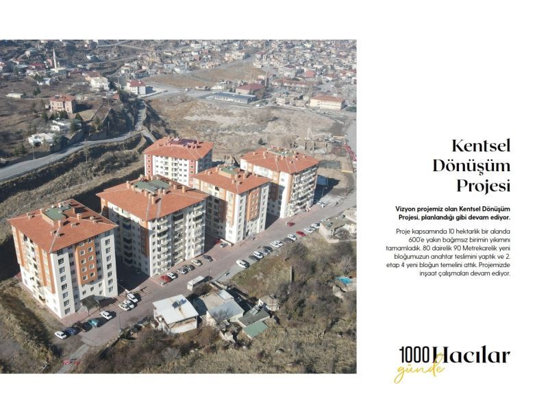 Cumhurbaşkanı Recep Tayyip Erdoğan’ın “Ak Partili belediyelerimizin tamamında 11 başlıkta özetlenen ilkeler ve hassasiyetler çerçevesinde hizmet sunmaya devam edeceğiz” düsturuyla çıkılan yolda çalışmalarını sürdürdüklerini belirten Hacılar Belediye Başkanı Av. Bilal Özdoğan, bin günlük çalışmalarını çıkarttıkları kitapçıkla özetledi. Bir çok yapılan proje ve çalışmaların detaylı bir şekilde yer aldığı kitapçıkta, başta vizyon proje olarak adlandırılan Kentsel Dönüşüm Projesi olmak üzere Hacılar Erciyes yolu, Fevzi Mercan Stadyumu, 15 Temmuz Şehitler Parkı, Kızıltepe Millet Bahçesi, Ören Dere Kanalı, Halit Özkaya Kütüphanesi, Hisarcık Yolu, Ülfet Murat Özdemir Aile Sağlığı Merkezi, Ali Atay Şaşoğlu Ortaokulu, Hürmetçi Manda Sütü İşleme Tesisi, Mehmet Özer Çocuk Kütüphanesi gibi bir çok projenin yanı sıra alt yapı çalışmaları, araç parkuru, yol yapım çalışmaları, sosyal alanlar, imar uygulamaları ve revizyon çalışmalarının yer aldığı bir çok çalışma yer alıyor.