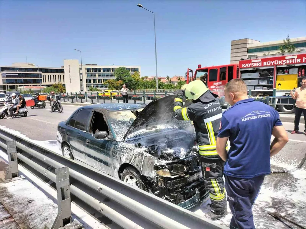 Kayseri’de hareket halindeki otomobil bir anda alev alırken, otomobilde bulunan baba ve oğlu yara almadan kurtuldu.