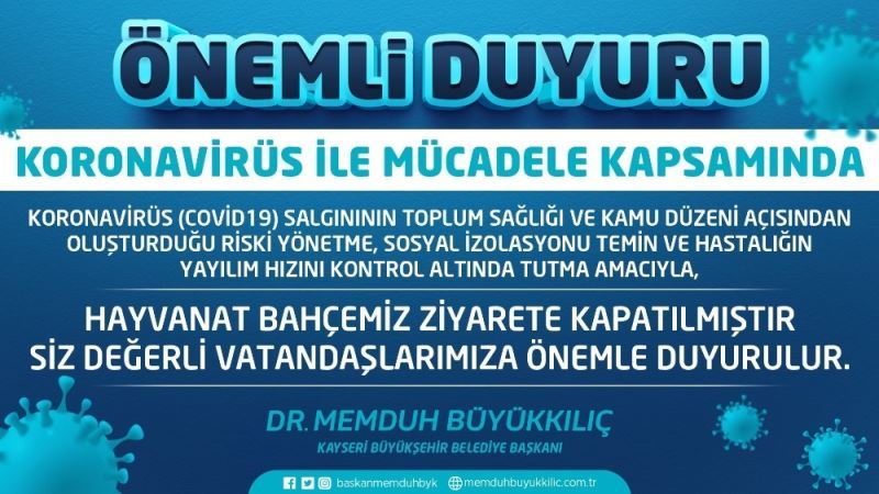 Kayseri Büyükşehir Belediyesi Anadolu Harikalar Diyarı Hayvanat Bahçesi, İçişleri Bakanlığı genelgesi doğrultusunda ziyarete kapatıldı.