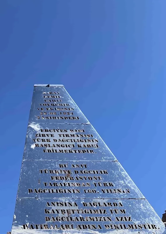"Albay Cemil Cahit Toydemir ve ekibinin 28.08.1924 tarihindeki Erciyes Dağı zirve tırmanışı Türk dağcılığının başlangıcı kabul edilmektedir. Bu anıt, Türkiye Dağcılık Federasyonu tarafından Türk dağcılığının 100. yılının anısına dağlarda kaybettiğimiz tüm dağcılarımızın aziz hatıraları adına dikilmiştir."