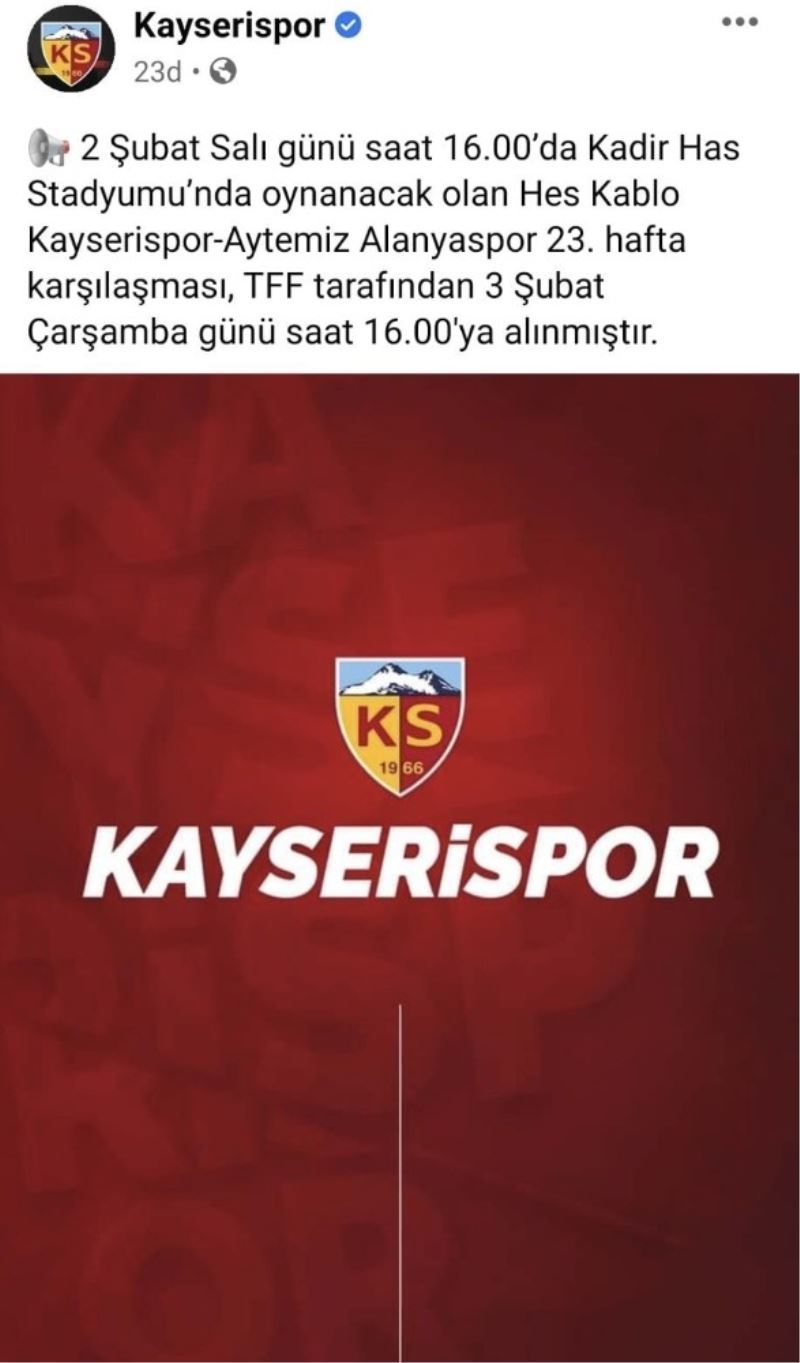 “ 2 Şubat Salı günü saat 16.00’da Kadir Has Stadyumunda oynanacak olan Hes Kablo Kayserispor - Aytemiz Alanyaspor 23. hafta karşılaşması, TFF tarafından 3 Şubat Çarşamba günü saat 16.00’a alınmıştır.”