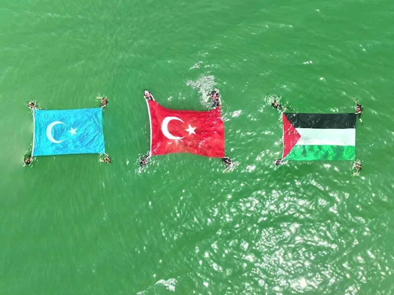 İsrail terörü tarafından 8 aydır katliama uğrayan Gazzeli ve Çin zulmü altındaki Doğu Türkistanlı Müslümanlara dikkat çekmek için Kayseri İHH Arama Kurtarma Ekibi dalgıçları, Yamula Barajı’nın Kuşçu bölgesine dev Türk Bayrağı yanı sıra Doğu Türkistan ve Filistin Bayrağı çekti.