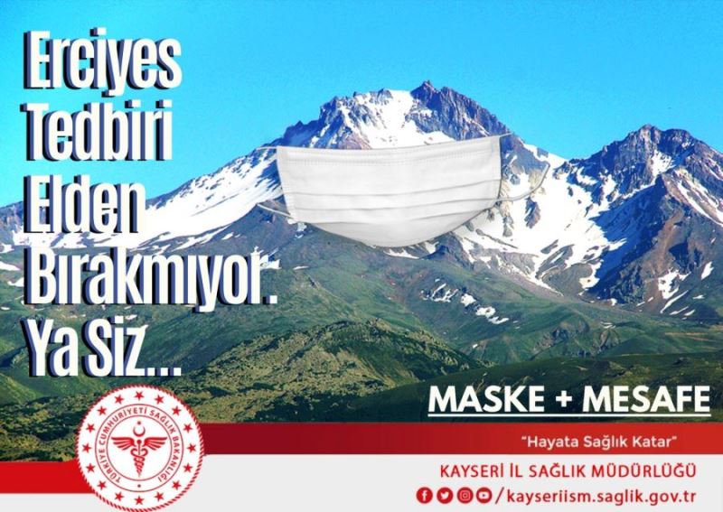 Kayseri İl Sağlık Müdürlüğü'nün sosyal medya hesaplarından paylaşılan fotoğrafta, Türkiye'nin önemli kayak merkezlerinden biri olan, Kayseri'nin simgesi olan Erciyes Dağı'na photoshop ile maske giydirildi. Yapılan paylaşımda 'Erciyes tedbiri elden bırakmıyor. Ya siz!" mesajına yer verilirken, maske, mesafe ve temizlik konularında da uyarıda bulunuldu.(İHA)