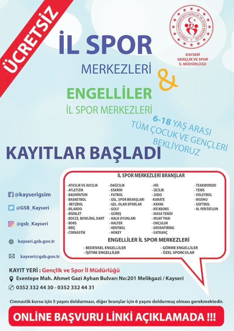 Kayseri Gençlik ve Spor İlMüdürlüğü tarafından düzenlenecek olan İl Spor Merkezleri ve Engelliler İl Spor Merkezleri için kayıtlar online olarak başladı.