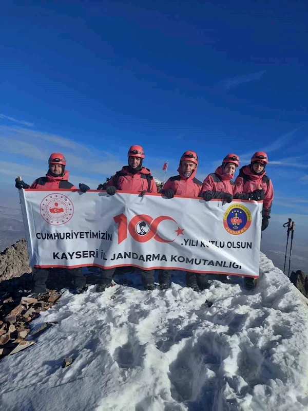 Cumhuriyetin 100.yılı dolayısıyla Kayseri İl Jandarma Komutanlığı JAK Tim Komutanlığınca Erciyes Dağı’na zirve tırmanışı gerçekleştirdi. Zirve tırmanışını tamamlayan ekipler; "Cumhuriyetimizin 100. yılı kutlu olsun" mesajı verdi.