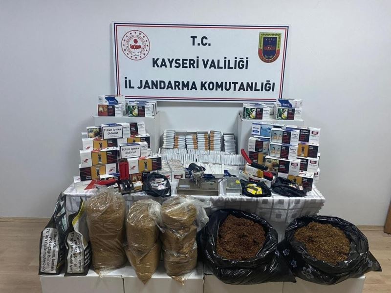 Kayseri İl Jandarma Komutanlığı Kaçakçılık ve Organize Suçlarla Mücadele Şube Müdürlüğü, Kocasinan İlçe Jandarma komutanlığı ve JASAT ekipleri tarafından kaçak sigara, kaçak makaron ve tütün satışı yapan şahıslara yönelik çalışma başlatıldı. Yapılan çalışmalarda H.D.’nin kaçak makaron, kaçak tütün ve tütün mamulleri satışı yaptığı bilgisinin alınması üzerine, Melikgazi İlçesi Bahçelievler Mahallesinde bulunan 2 farklı adresinde ve aracında tütün ve narkotik köpeği eşliğinde yapılan aramalarda 28 bin adet kaçak boş makaron, 4 bin 800 adet bandrolsüz içerisine kaçak tütün basılmış dolu makaron, 40 kilo bandrolsüz kıyılmış tütün, 1 adet makaron doldurmak için kullanılan dijital elektronik makina, 5 adet makaron doldurmak için kullanılan el tütün basım makinası ve poşetler içerisinde saklanmış 285 adet kullanılmış bandrol ele geçirildi Ele geçirilen malzemelerin piyasa fiyatının yaklaşık olarak 25 bin 750 TL olduğu belirlendi.