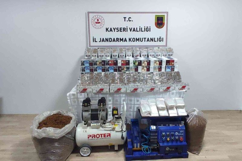 Kayseri İl Jandarma Komutanlığı ekipleri tarafından kaçak sigara, kaçak makaron ve tütün satışı yapan şahıslara yönelik istihbari çalışma başlatıldı. Yapılan çalışmalar sonucunda Kocasinan ilçesine bağlı Osmangazi Mahallesi’nde kaçak makaron ile kaçak tütün ve tütün mamulleri imalat ve satışının yapıldığı tespit edildi. Adrese operasyon düzenleyen jandarma ekipleri tarafından ikamette yapılan aramalarda 9 bin 600 adet bandrolsüz içerisine kaçak tütün basılmış dolu makaron, 32 kilogram bandrolsüz kıyılmış tütün, 74 bin 800 adet bandrolsüz boş makaron, 3 bin 800 adet kilitli boş poşet, 1 adet 50’lik hava kompresörü ve 1 adet dijital kompresörlü tütün basma makinesi bulundu.