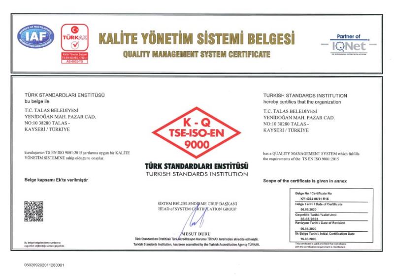 Talas Belediyesi’nin 2006 yılından beri sahip olduğu Kalite Yönetim Sistemi Belgesi, TSE Kayseri Bölge Koordinatörlüğü tarafından yapılan tetkik sonucu yenilendi. Böylece Talas Belediyesi’ndeki uygulamaların kalitesi ve başarısı bir kez daha tescillenmiş oldu.
