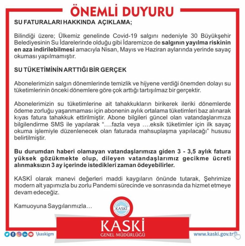 KASKİ Genel Müdürlüğü tarafından su faturalarına ilişkin açıklama yapılmıştır.