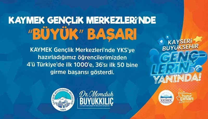 Kayseri Büyükşehir Belediyesi bünyesinde mesleki eğitim ve kültür sanat faaliyetlerini sürdüren Kayseri Mesleki Eğitim ve Kültür A.Ş.’nin Gençlik Merkezleri’nde Yükseköğretim Kurumları Sınavı (YKS) için ücretsiz olarak kurslara katılan öğrenciler büyük başarı sergiledi. YKS’ye hazırlanan KAYMEK Gençlik Merkezi öğrencilerinden 4’ü Türkiye’de ilk bine, 36’sı ilk 50 bine, onlarca öğrenci de ilk 100 bine girdi.