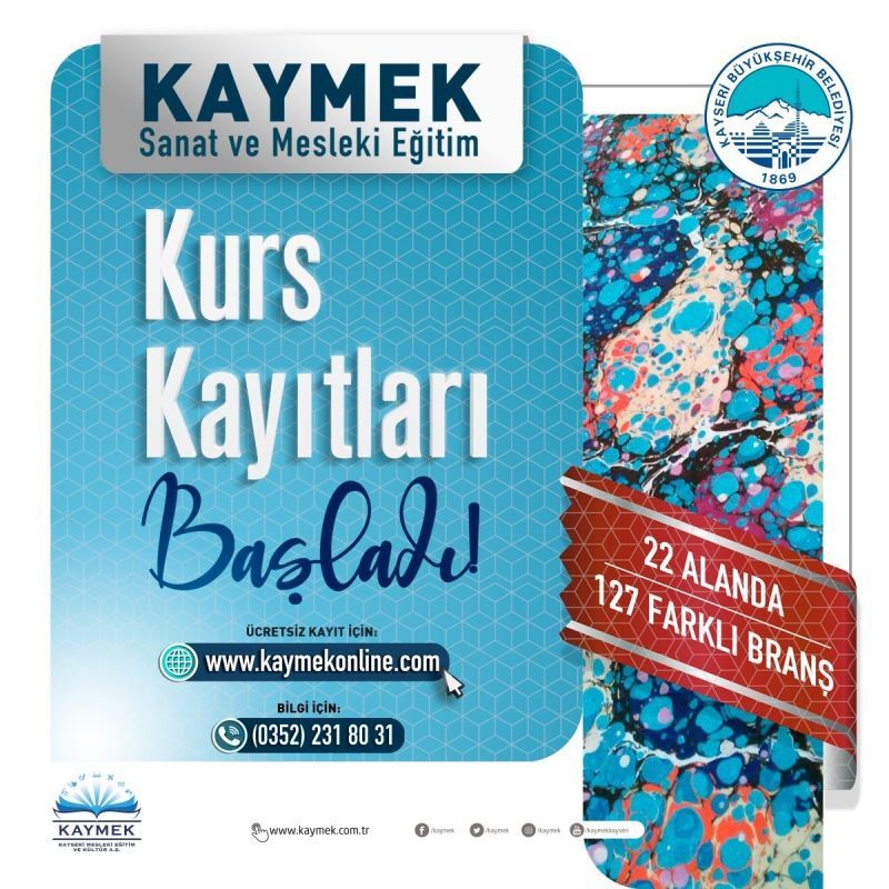 Kayseri Büyükşehir Belediyesi bünyesinde faaliyet gösteren Kayseri Mesleki Eğitim ve Kültür A.Ş. (KAYMEK)’in 22 alanda 127 farklı branşta eğitimleri içeren 2022-2023 eğitim ve öğretim yılı 2. dönem kurs kayıtları başladı. 16 Ocak Pazartesi günü başlayan kurs kayıtları ilk saatlerde vatandaşlardan yoğun ilgi görürken, kontenjanlar yüzde 80 oranında doldu.