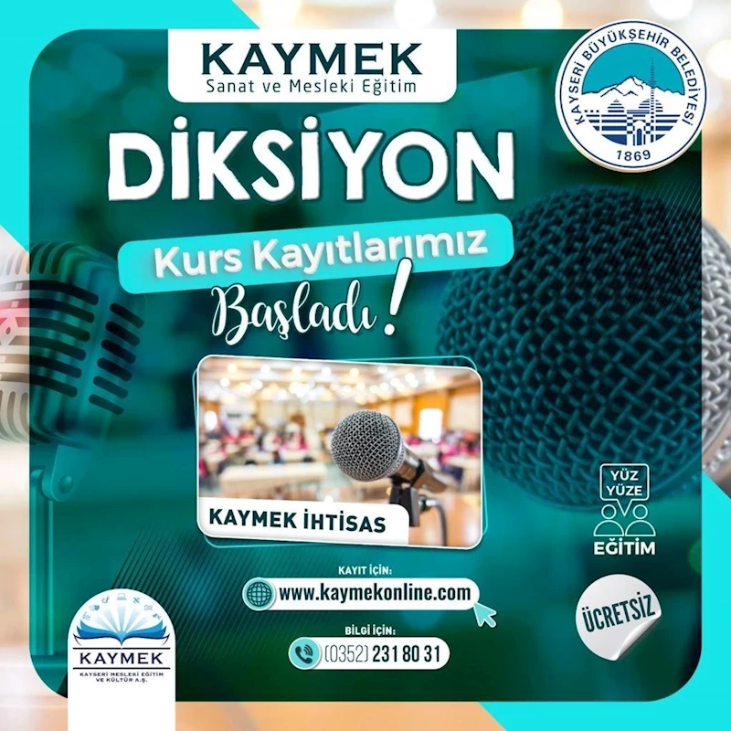 Kayseri Büyükşehir Belediyesi’nin eğitim ve kültür kuruluşu KAYMEK tarafından düzenlenecek diksiyon kursu kayıt almaya başladı.