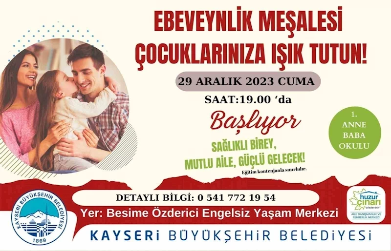 Kayseri Büyükşehir Belediyesi bünyesinde faaliyetlerini yürüten Kayseri Mesleki Eğitim ve Kültür A.Ş.’nin (KAYMEK) Huzur Çınarı Aile Danışmanlık ve Rehberlik Merkezi ’Ebeveynlik Meşalesi: Çocuklarınıza Işık Tutun’ eğitim programı düzenliyor.