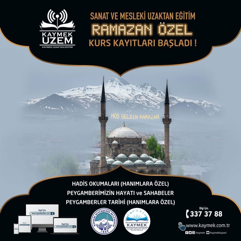 Kayseri Büyükşehir Belediyesi Mesleki Eğitim ve Kültür A.Ş. (KAYMEK), Ramazan ayına özel program ve etkinliklerle Ramazan bereketini vatandaşlara yaşatıyor. Ayrıca KAYMEK Uzaktan Eğitim Merkezi (UZEM) ise Ramazan’a özel kurslar için kayıtlar almaya başladı.