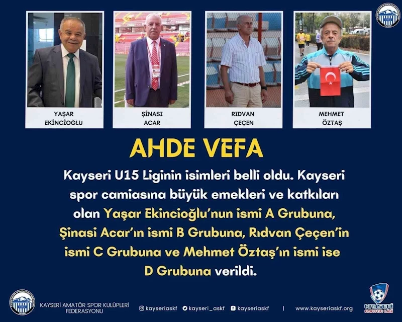 Kayseri Amatör Spor Kulüpleri Federasyonu’ndan (ASKF) geçtiğimiz hafta başlayan U15 Ligine ahde vefa örneği sergileyerek, spor camiasına emeği olan kişilerin isimlerini gruplara verdi.