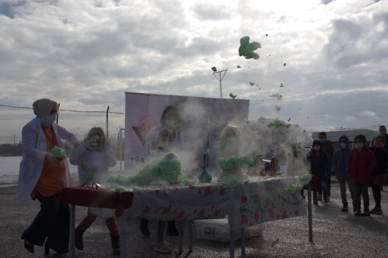 Bilimsel alanlarda çok sayıda sergi düzeneği ile çocuklara keyifli dakikalar yaşatan uzmanlar, öğrencilere temizlik maddeleri, dezenfektanlar ve kimyasallar konusunda bilgilendirmelerde bulunup, deneyler yaptı.