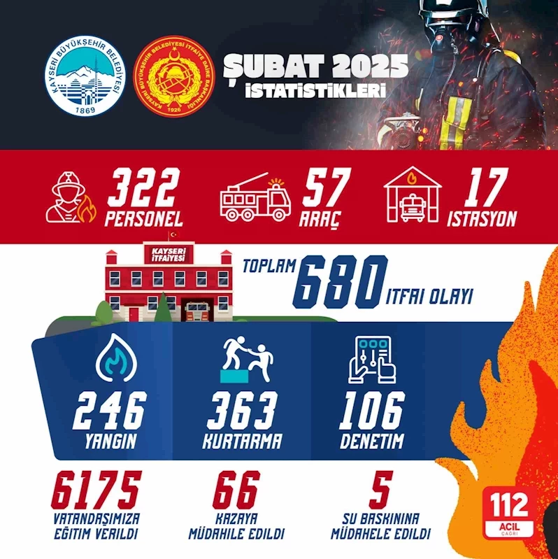 Kayseri Büyükşehir Belediyesi İtfaiye Daire Başkanlığı ekipleri doğal afet, yangın, kaza, arama kurtarma gibi sorumluluk alanına giren her konuda büyük bir fedakârlık ve özveri ile görevini yürütüyor. Büyükşehir İtfaiye Daire Başkanlığı ekipleri, Şubat ayında 680 olaya müdahale ederken, 6 bin 175 vatandaşa eğitim verdi ve 106 denetim gerçekleştirdi.