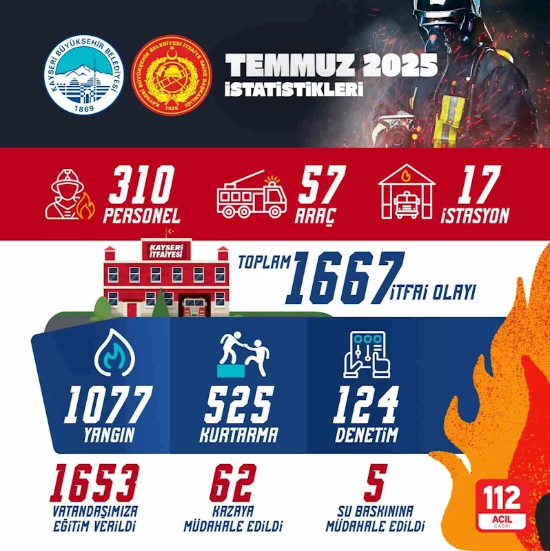 Kayseri Büyükşehir Belediyesi İtfaiye Daire Başkanlığı; 2025 yılının Temmuz ayında da fedakâr ve özverili çalışmalarını sürdürerek toplam bin 667 olaya başarıyla müdahale etti.