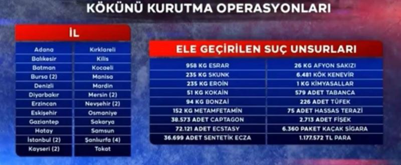 Türkiye genelinde yapılan ’Kökünü Kurutma’ operasyonlarında Kayseri İl Emniyet Müdürlüğü Narkotik Şube Müdürlüğü ekipleri, yaptıkları çalışmalarla ilk 4’e girme başarısını gösterdi.