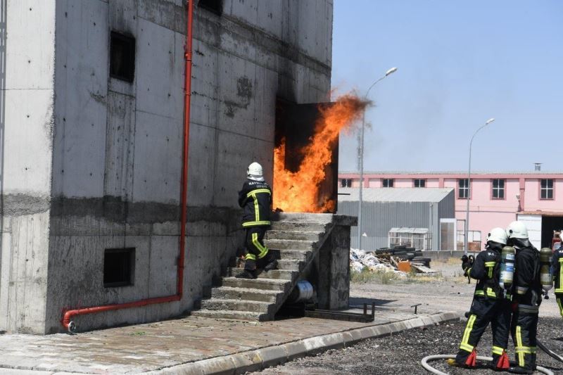 Kayseri Organize Sanayi Bölgesi İtfaiye Müdürlüğü ekipleri, çıkabilecek yangınlara karşı her zaman hazırlıklı olabilmek için eğitimlerini ara vermeden sürdürüyor. İtfaiye ekipleri, tatbikat senaryosu gereği bir binada ve açık alanda çıkarılan iki ayrı yangına anında müdahale etti.