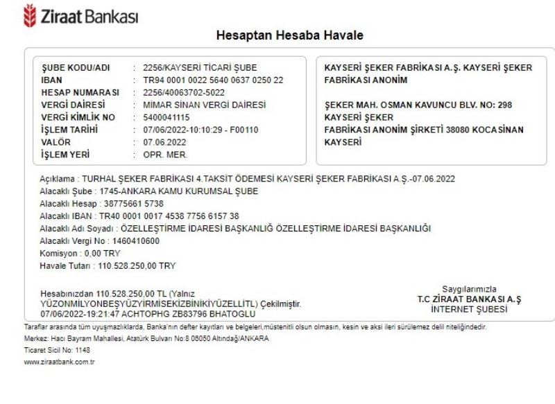 Kayseri Şeker tarafından, Turhal Şeker Fabrikası’nın son ödeme taksiti ile ilgili açıklama yapılarak, son taksit ödemesine dair banka dekontu paylaşıldı.