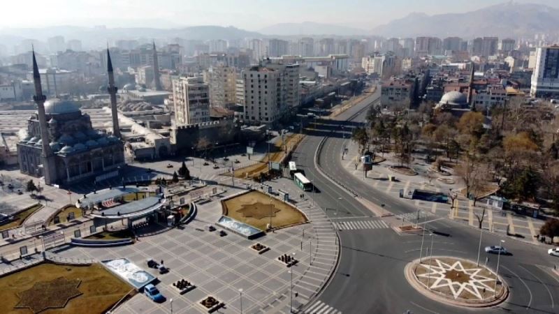 İçişleri Bakanlığı tarafından korona virüs ile mücadele kapsamında hafta sonu uygulanan 72 saatlik sokağa çıkma kısıtlamasında Kayseri sessiz kaldı. Normal günlerde araç ve yaya yoğunluğunun çok olduğu Cumhuriyet meydanı, vatandaşlar evlerinde kalınca boş kaldı. Meydan da yaşanan sakinlik ise havadan görüntülendi.