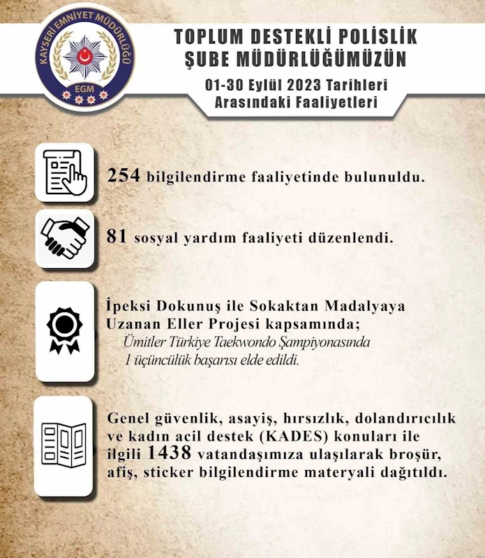 Edinilen bilgiye göre; Toplum Destekli Polislik Şube Müdürlüğü ekiplerince 1-30 Eylül tarihleri arasındaki 254 bilgilendirme faaliyetinde bulunuldu, 81 sosyal yardım faaliyeti düzenledi, İpeksi Dokunuş ile Sokaktan Madalyaya Uzanan Eller Projesi çerçevesinde Ümitler Türkiye Taekwondo Şampiyonasında; 1 üçüncülük başarısı elde edildi.