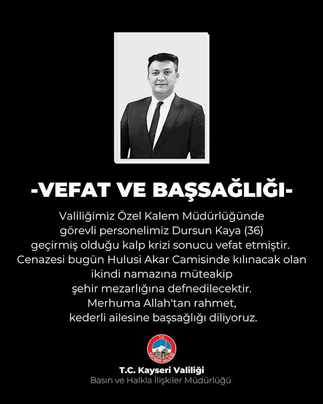 Kayseri Valiliği Özel Kalem Müdürlüğü’nde çalışan Dursun Kaya, geçirdiği kalp krizi sonucu 36 yaşında hayatını kaybetti.