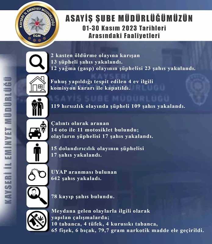 Kayseri İl Emniyet Müdürlüğü Asayiş Şube Müdürlüğü ekipleri tarafından 01-30 Kasım tarihleri arasında yapılan çalışmalarda 119 hırsızlık olayının şüphelisi 109 şahıs yakalanırken, çalıntı olarak aranan 14 oto ve 11 motosiklet de bulundu, olayların hırsızlık şüphelisi 17 şahıs da yakalandı. Yine ekipler tarafından yapılan çalışmalarda fuhuş yapıldığı tespit edilen 4 ev de ilgili komisyon kararı ile kapatıldı.